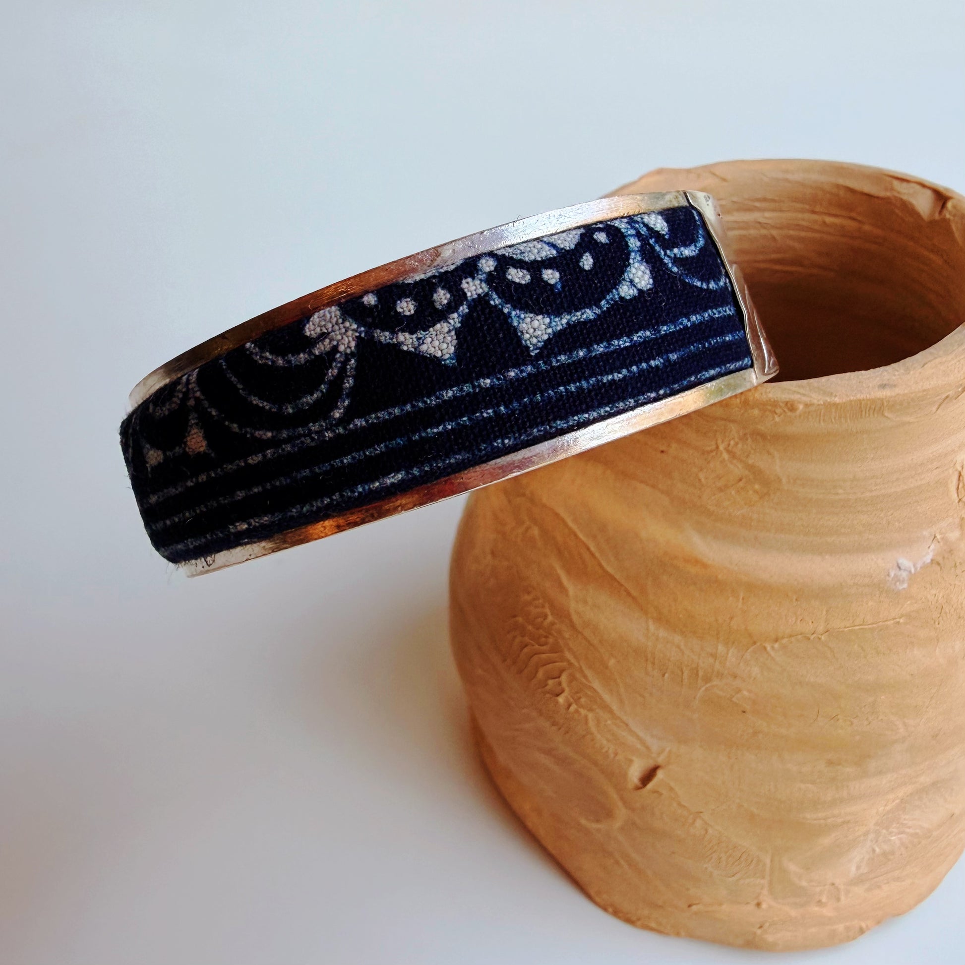 A handmade cuff that pairs deep indigo textile with a traditional Miao-inspired silver-tone setting. The fabric inlay features classic woven motifs, so each bracelet carries its own small differences in pattern and texture—quietly one of a kind.