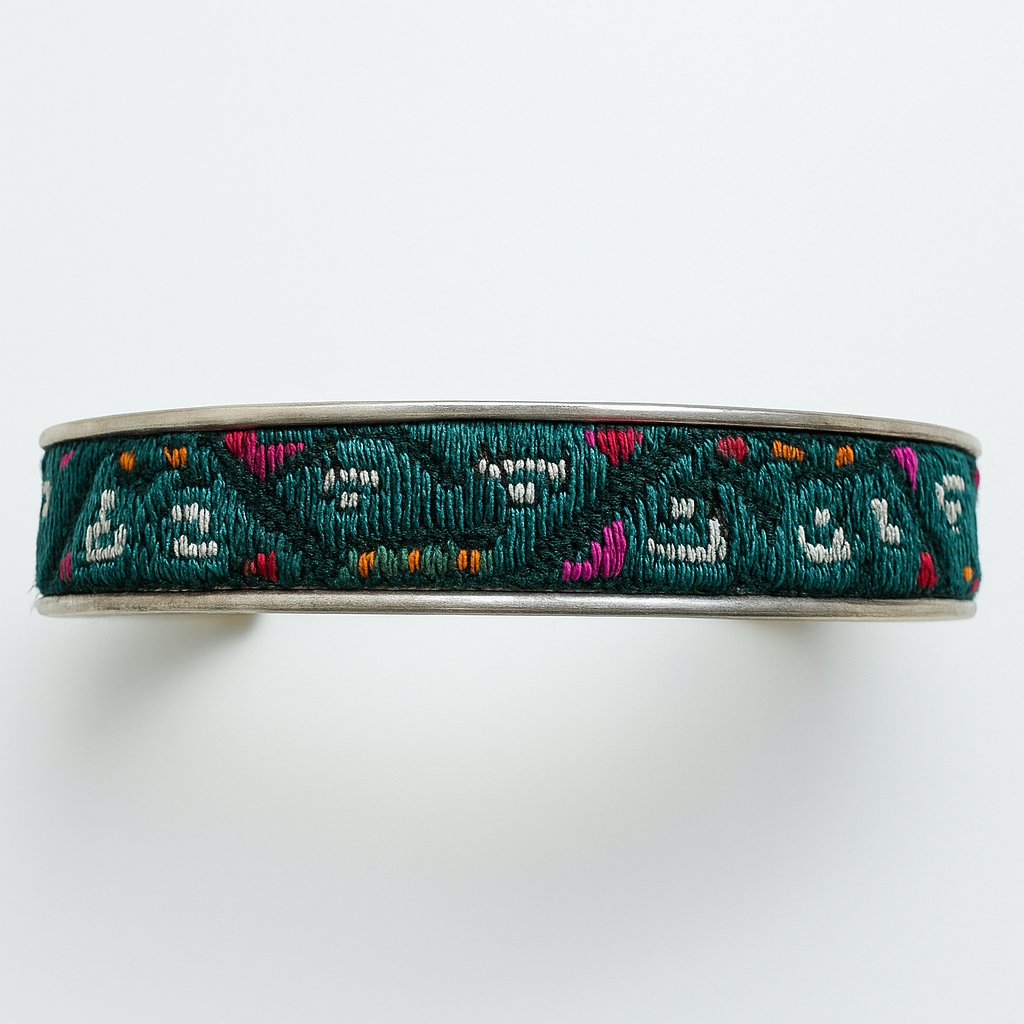 An open cuff made with Miao silver and an inlay of antique embroidered textile. The embroidery comes from older hand-stitched fabric, so each piece has its own pattern placement.