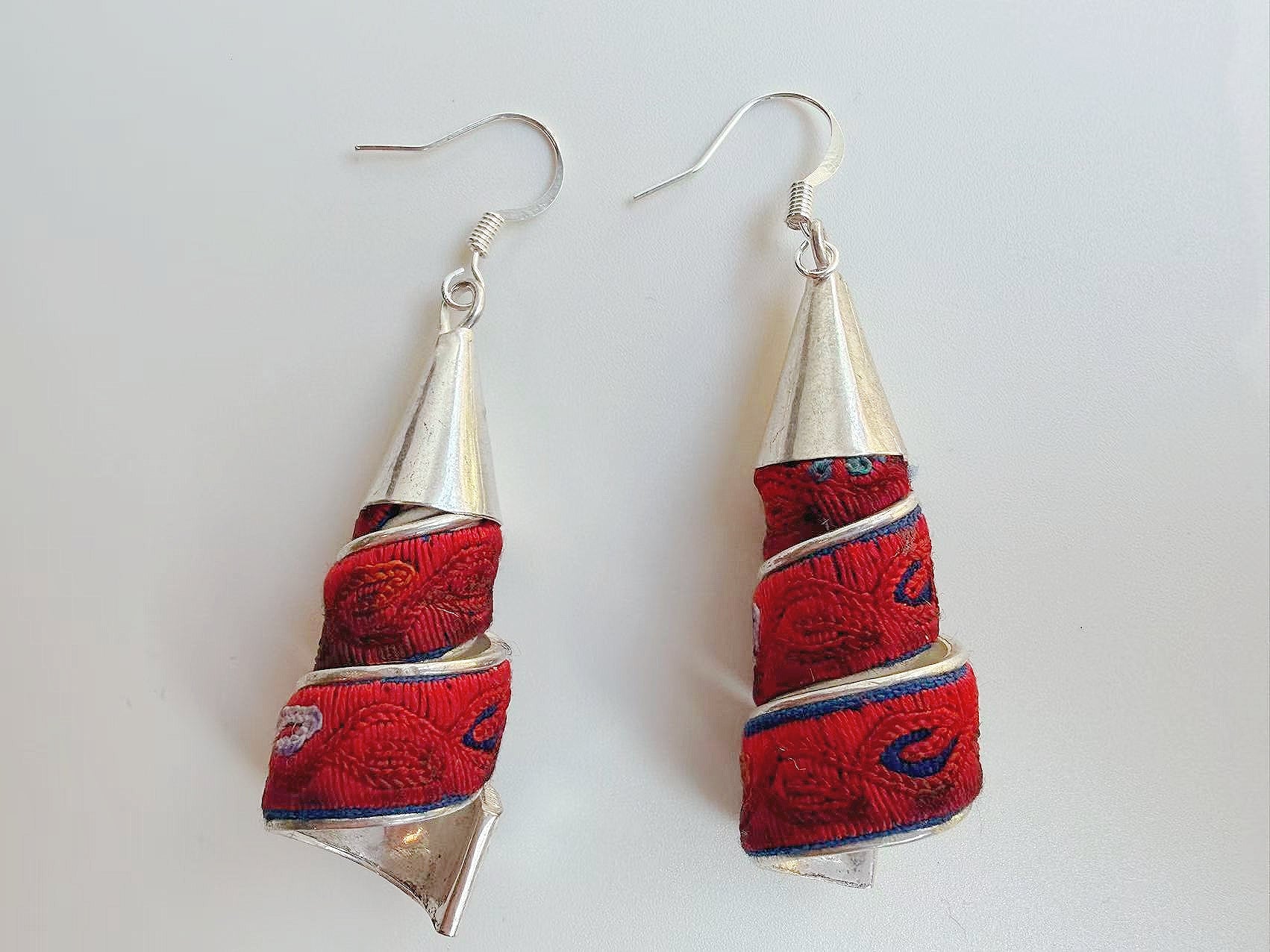 A pair of wearable heirloom-inspired earrings made with vintage Miao-style embroidered textile. The silver-toned cone and spiral-wrapped fabric create bold dimension and gentle movement—an easy statement for everyday outfits, festivals, and travel looks.