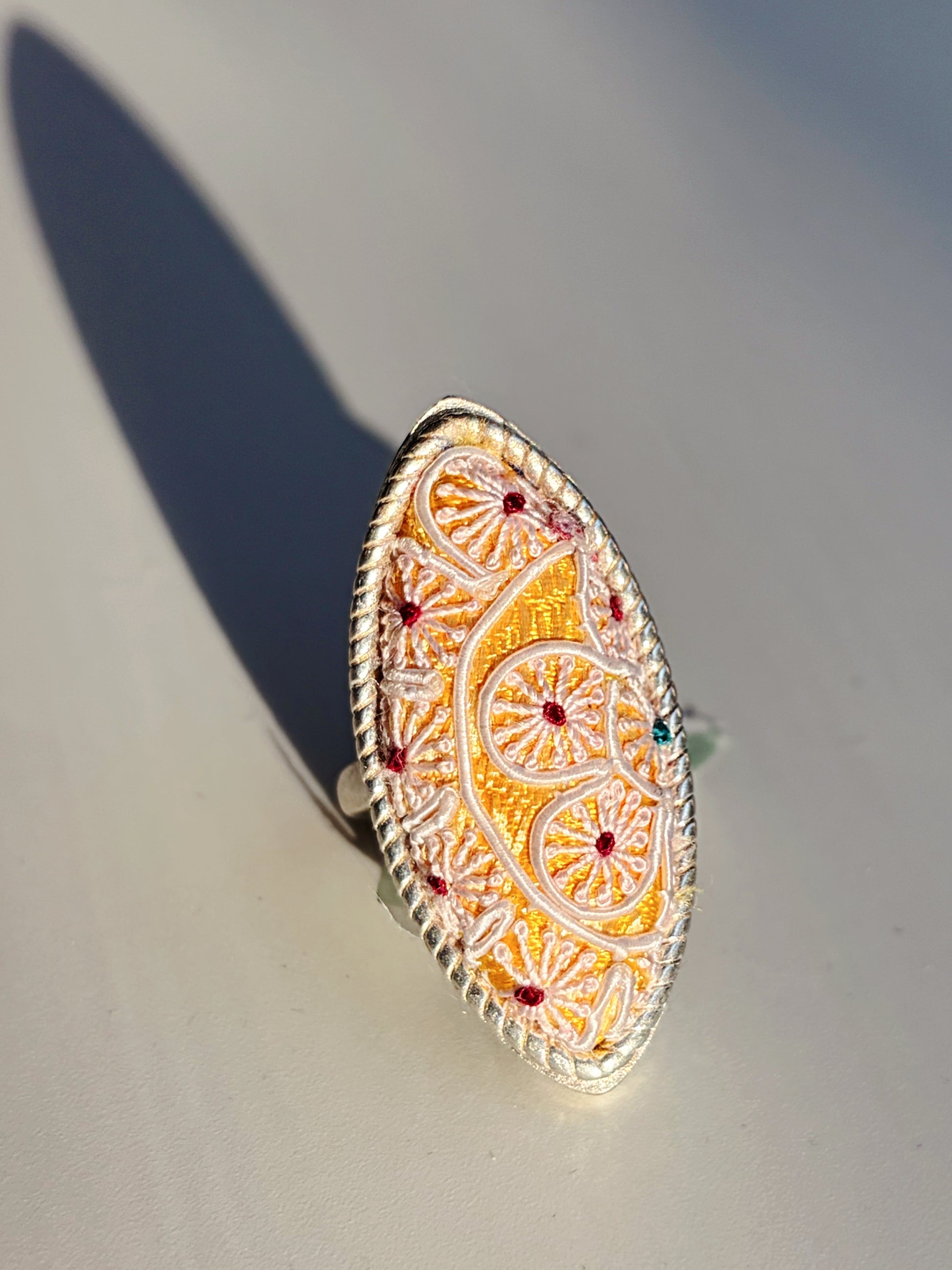 Each ring is one of a kind: the motif, stitch placement, and patina will vary slightly because every embroidery fragment is unique.